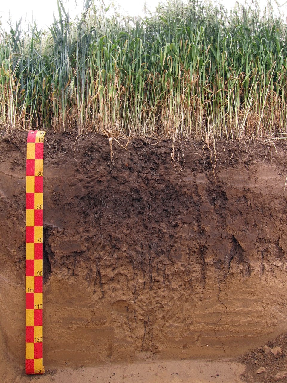 Fruchtbare Parabraunerde (dunkelbraun) auf Löss (ockergelb), bis zu mehrere Meter dick und mit enormer Wasser-Speicherkapazität, die Wachstum auch bei längeren Trockenperioden ermöglicht. Die Gerste-Wurzeln reichen bis in etwa 1,5 Meter Tiefe.