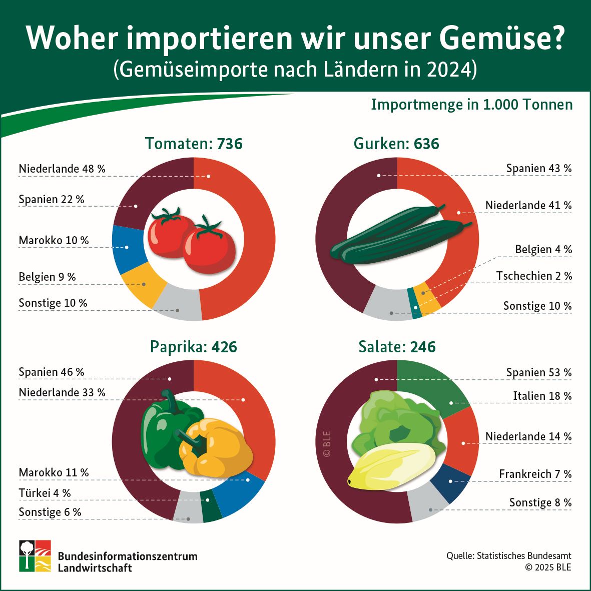 Von den insgesamt 2.514,17 Millionen Kilo, die 2015 weltweit gekauft wurden, importierte die USA 805,26 Millionen Kilo (32,03%) und Deutschland 514,76 Kilo (20,47%) Gurken. Die zwei Länder kaufen zusammen die Hälfte aller in der Welt verkauften Gurken. Das UK steht an dritter Stelle mit 152,45 Millionen Kilo (6,06%).