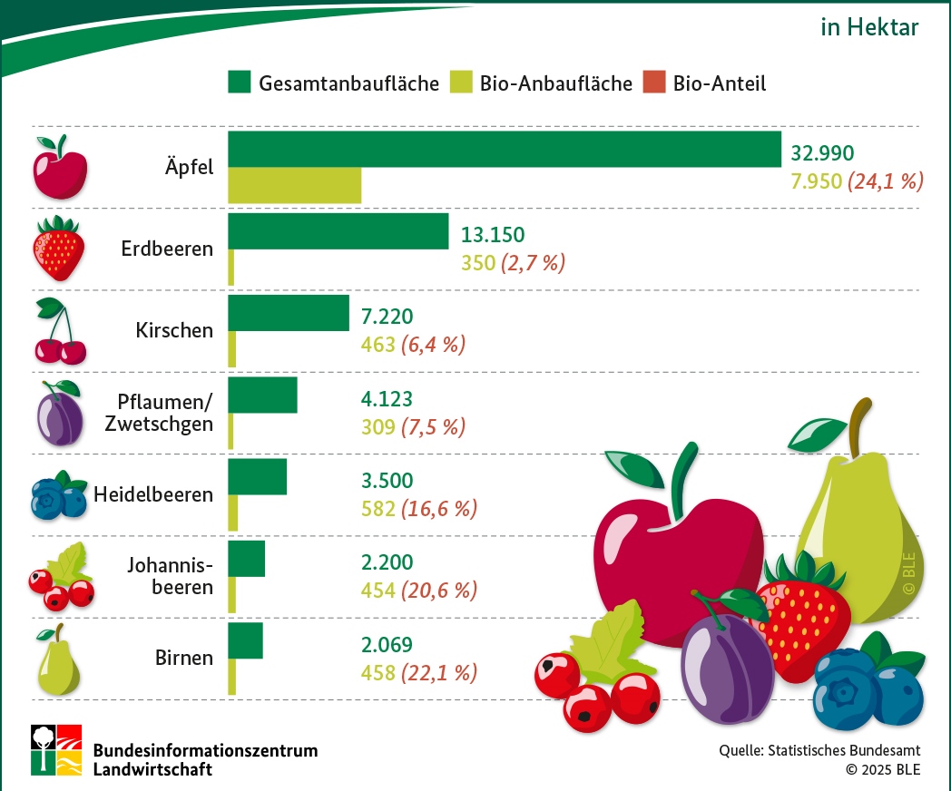 In Deutschland wurden 2024 auf einer Fläche von 69.400 Hektar Obst, Strauchbeeren und Erdbeeren angebaut, das sind gerade einmal 0,5 Prozent der gesamten landwirtschaftlich genutzten Fläche. 1,2 Millionen Tonnen Obst wurden 2024 in Deutschland geerntet. Drei Viertel davon machten Äpfel aus. Mit deutlichem Abstand folgten Erdbeeren mit einem Anteil von 10,4 Prozent.