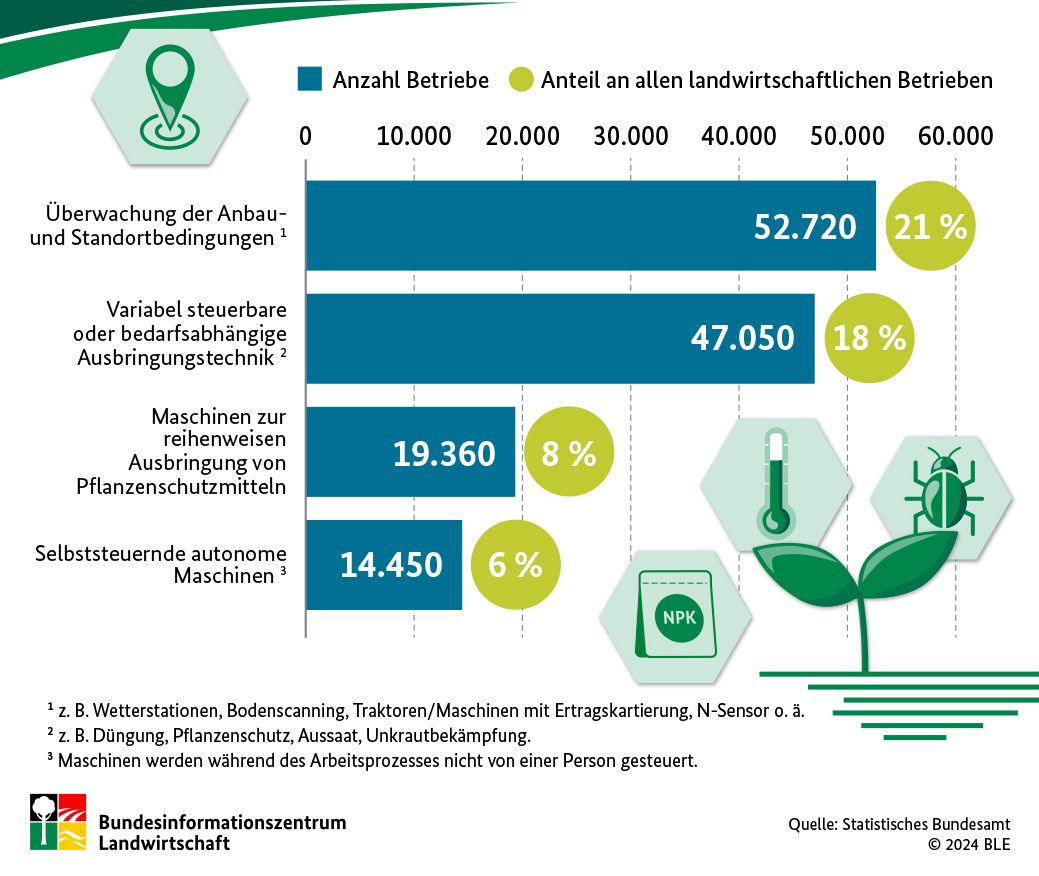 In den Jahren 2022/2023 überwachten knapp 53.000 landwirtschaftliche Betriebe ihre Anbau- und Standortbedingungen. Das entspricht rund 21 Prozent aller Betriebe. Dazu setzten Landwirtinnen und Landwirte beispielsweise Wetterstationen, Bodenscanning, Maschinen mit Ertragskartierung oder N-Sensoren ein.