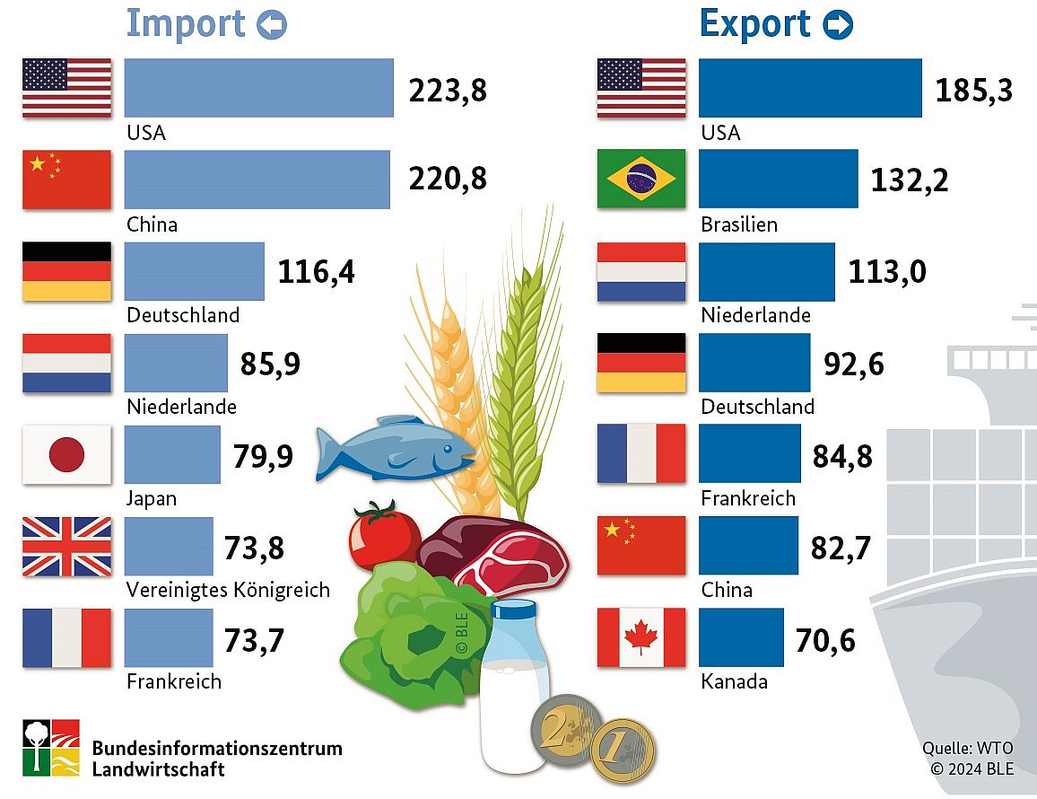 Werden Exporte und Importe miteinander verrechnet, ergibt sich für Deutschland ein Agrarhandelsdefizit von 21 Milliarden US-Dollar (2022). Damit steht Deutschland auf Platz 6 der größten Nettoimporteure von Agrarprodukten. China, Japan und das Vereinigte Königreich haben weitaus größere Nettoimporte.