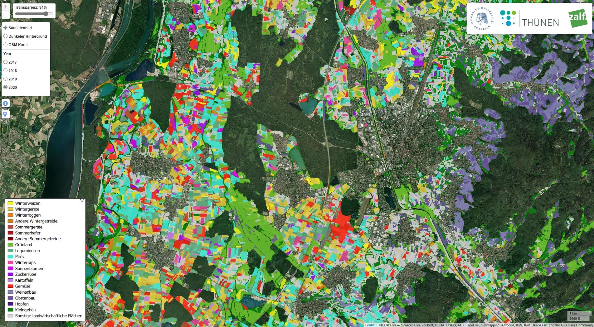 Für die Kartenerstellung nutzten die Wissenschaftlerinnen und Wissenschaftler Verfahren des maschinellen Lernens, verfügbare Informationen zur bisherigen Flächennutzung der Landwirte und Daten der US-amerikanischen Satellitenmission Landsat 8 sowie des Copernicus-Programms der europäischen Weltraumbehörde (ESA), deren Satelliten seit 2016 die Erde umkreisen. Um regionale Besonderheiten sowie saisonale und jahresbedingte Schwankungen zu berücksichtigen, wurden weiterhin Wetterdaten des Deutschen Wetterdienstes sowie das deutschlandweite Höhenmodell und das Digitale Landschaftsmodell des Bundesamtes für Kartographie und Geodäsie (BKG) einbezogen.