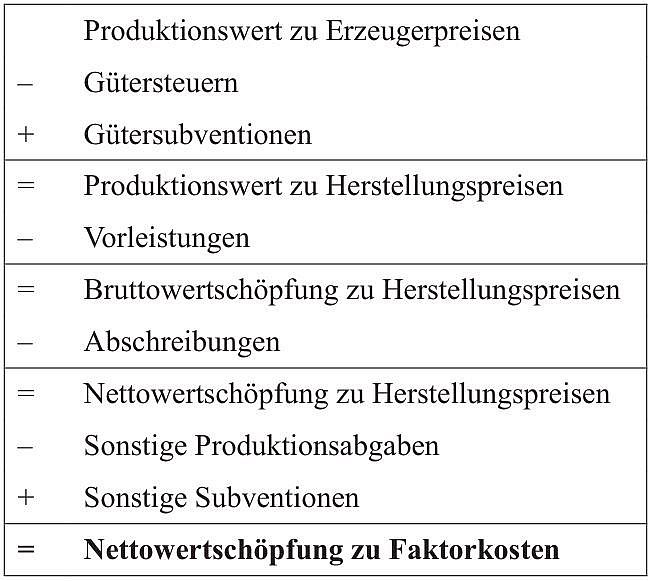 Im Gegensatz zur BWS sind in der Nettowertschöpfung sämtliche an die Landwirtschaft gezahlten Subventionen, einschließlich der Betriebsprämie berücksichtigt. Die Nettowertschöpfung ergibt sich aus der BWS nach Abzug der verbrauchsbedingten, zu Wiederbeschaffungspreisen bewerteten Abschreibungen sowie dem Saldo der sonstigen Produktionsabgaben und der sonstigen Subventionen (einschließlich eventuellem Überausgleich Mehrwertsteuer). Die Nettowertschöpfung steht zur Entlohnung der Produktionsfaktoren Boden, Arbeit und Kapital zur Verfügung.