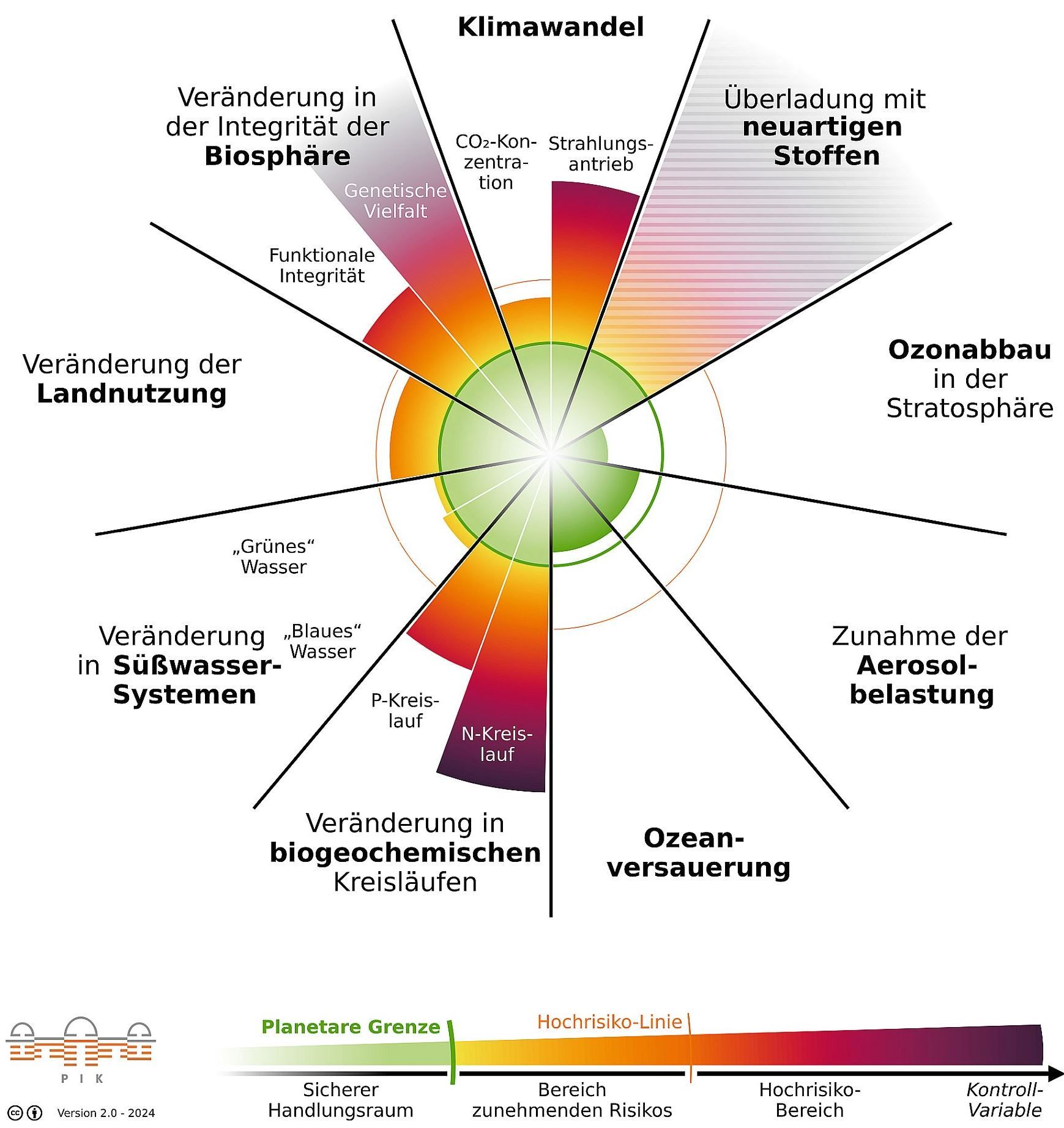 Die Daten für die obige Grafik stammen aus dem Planetary Health Check 2024. In dieser Darstellung repräsentiert die Länge der "Tortenstücke" den aktuellen Zustand in Bezug auf die Planetare Grenze (grüne Linie) und die Hochrisikolinie (orangene Linie). Ein weiches Auslaufen der Länge deutet den Unsicherheitsbereich an. Schraffierung bedeutet, dass jenseits der planetaren Grenze keine quantitative Bestimmung des aktuellen Zustands möglich ist.