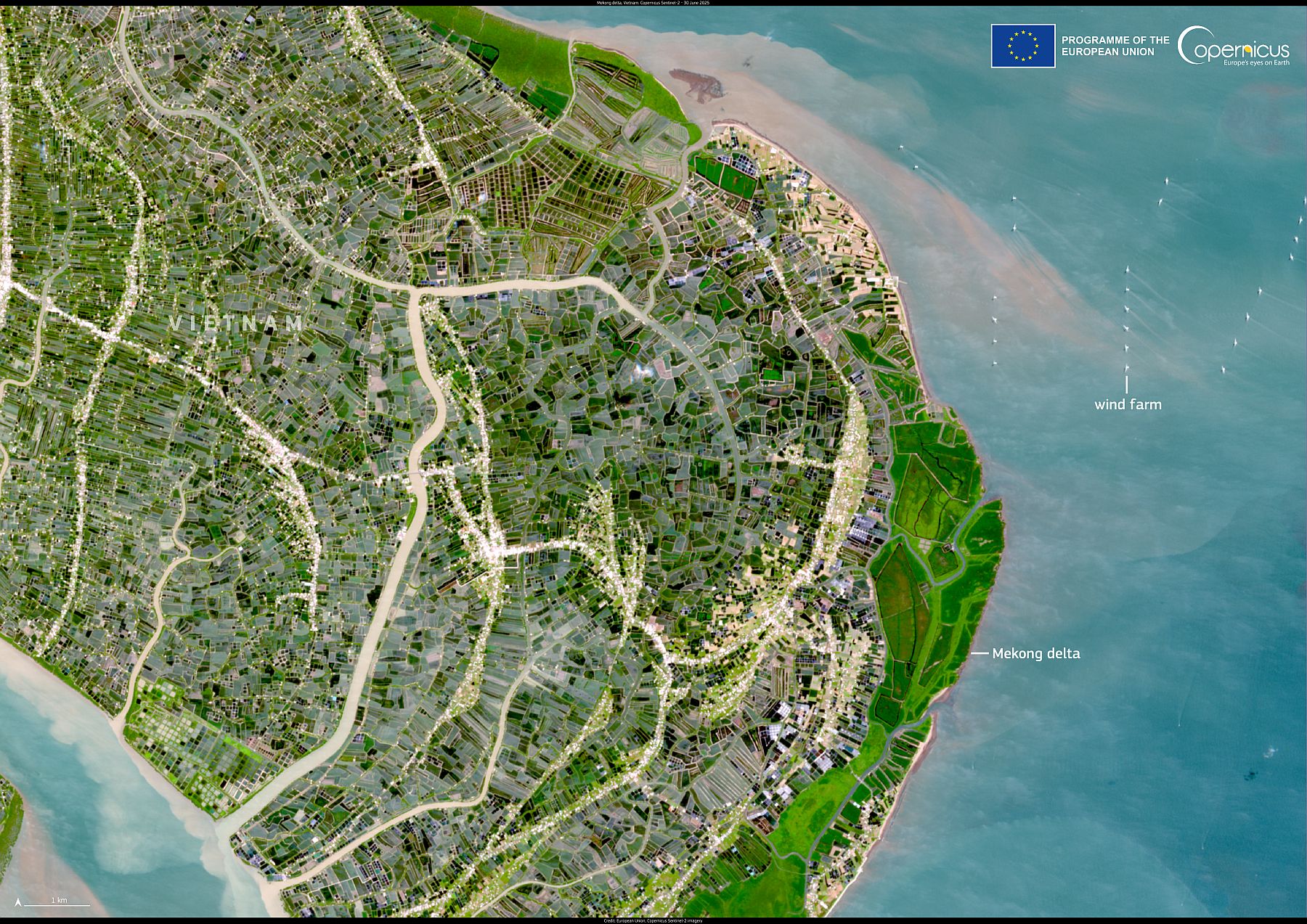 Dieses Copernicus Sentinel-2-Bild, aufgenommen am 30. Juni 2025, zeigt ein Flickwerk aus landwirtschaftlichen Parzellen, die sich über das Mekong-Delta erstrecken, wobei vor der Küste Offshore-Windparks zu sehen sind.
