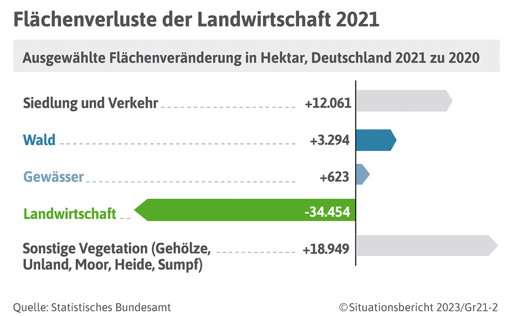 Deutschland nutzte 2015 für die Erzeugung pflanzlicher und tierischer Lebensmittel für den inländischen Konsum im In- und Ausland eine Fläche von 19,4 Mio. ha. Im Inland standen aber nur 14,2 Mio. ha für den Anbau von Nahrungsmitteln zur Verfügung (StBA 2018a). Folglich ist Deutschland Nettoimporteur von „virtuellen Agrarflächen“. (UBA)