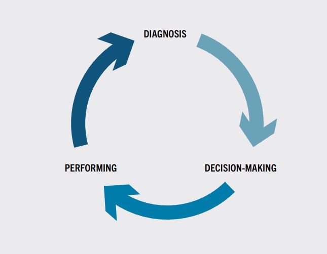 Der Durchführung einer landwirtschaftlichen Tätigkeit gehen immer zwei Phasen voraus: Diagnose (diagnosis) und Entscheidungsfindung (decision making). Die folgende Abbildung zeigt die drei Phasen als einen zyklischen Prozess mit ständiger Rückkopplung zwischen ihnen.