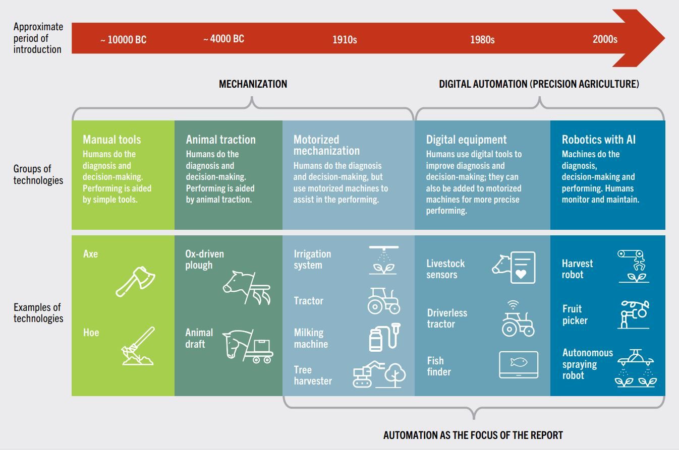 Die Abbildung ist eine Vereinfachung der historischen Realität der Entwicklung von Automatisierungstechnologien; es kann zu Überschneidungen und Grauzonen zwischen den Kategorien kommen. Dennoch hilft sie, die landwirtschaftliche Automatisierung zu definieren. Das Konzept der landwirtschaftlichen Automatisierung wird auf die drei blau schattierten Felder angewandt. Auf dieser Grundlage schlägt die FAO in ihrem Bericht eine Definition der Automatisierung in der Landwirtschaft vor: