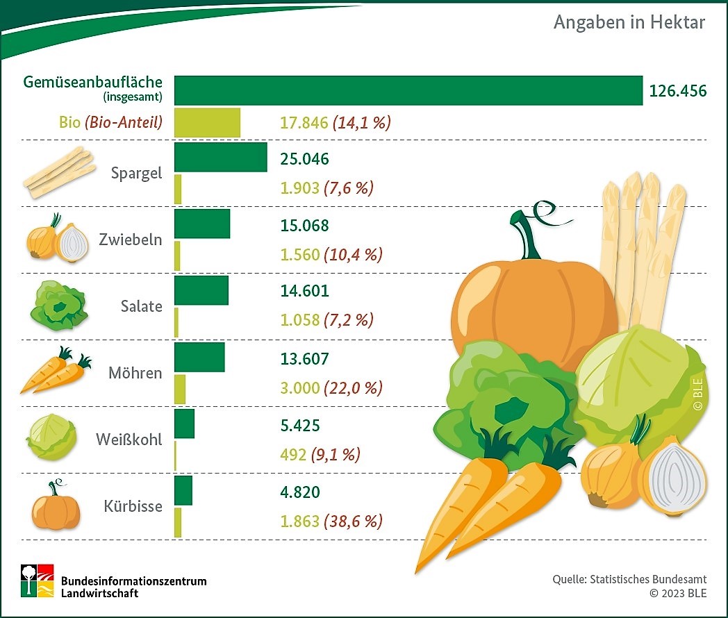 Welche Rolle der Bio-Anbau dabei spielt, ist höchst unterschiedlich. Bei Möhren fiel der Anteil der ökologisch bewirtschafteten Fläche mit 22 Prozent rund dreimal so hoch aus wie bei Salaten oder Spargel. Insgesamt wurde 2022 knapp ein Siebtel der Gemüseanbaufläche ökologisch bewirtschaftet.