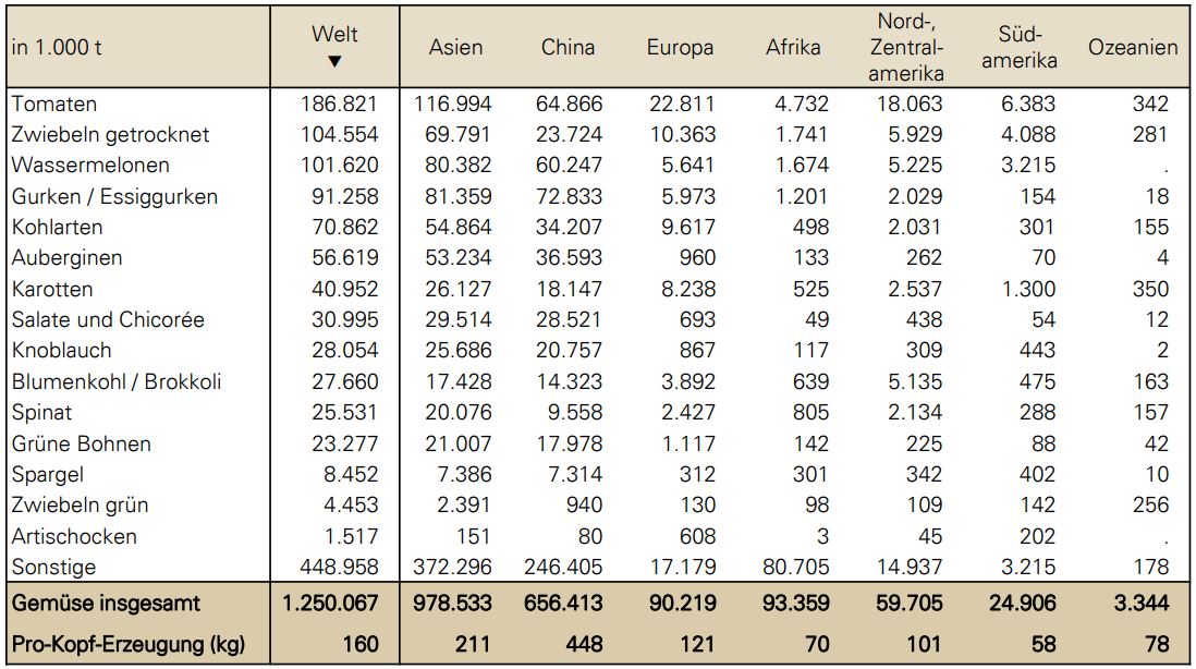 Seit 1990 ist die weltweite Produktion von Gemüse und Melonen fast um das 2,8-fache gestiegen. Die FAO gab die Gesamtweltgemüseerzeugung für das Jahr 2020 mit 1.250 Mio. t an. Seit mehreren Jahren entfällt davon mit 78 % der erzeugten Menge der weitaus größte Teil auf Produktionsstandorte in Asien. Das wichtigste Produktionsland in Asien bzw. weltweit ist China, wo mit 656 Mio. t im Jahr 2020 mehr als die Hälfte (53 %) der Weltproduktion stattfand.