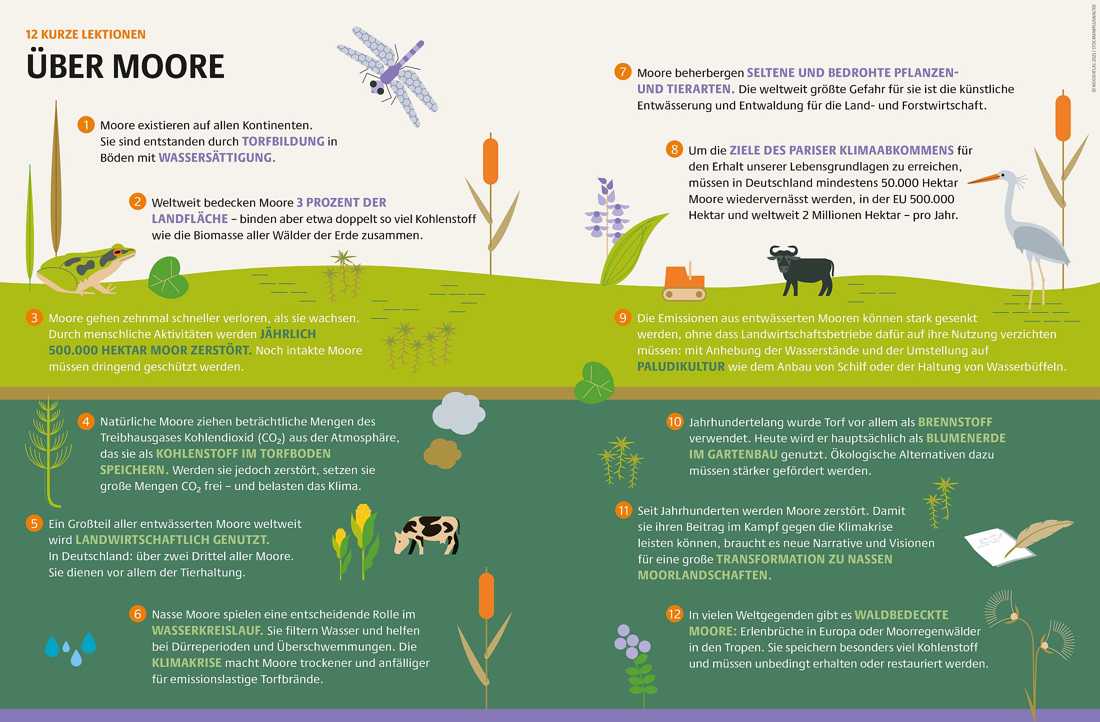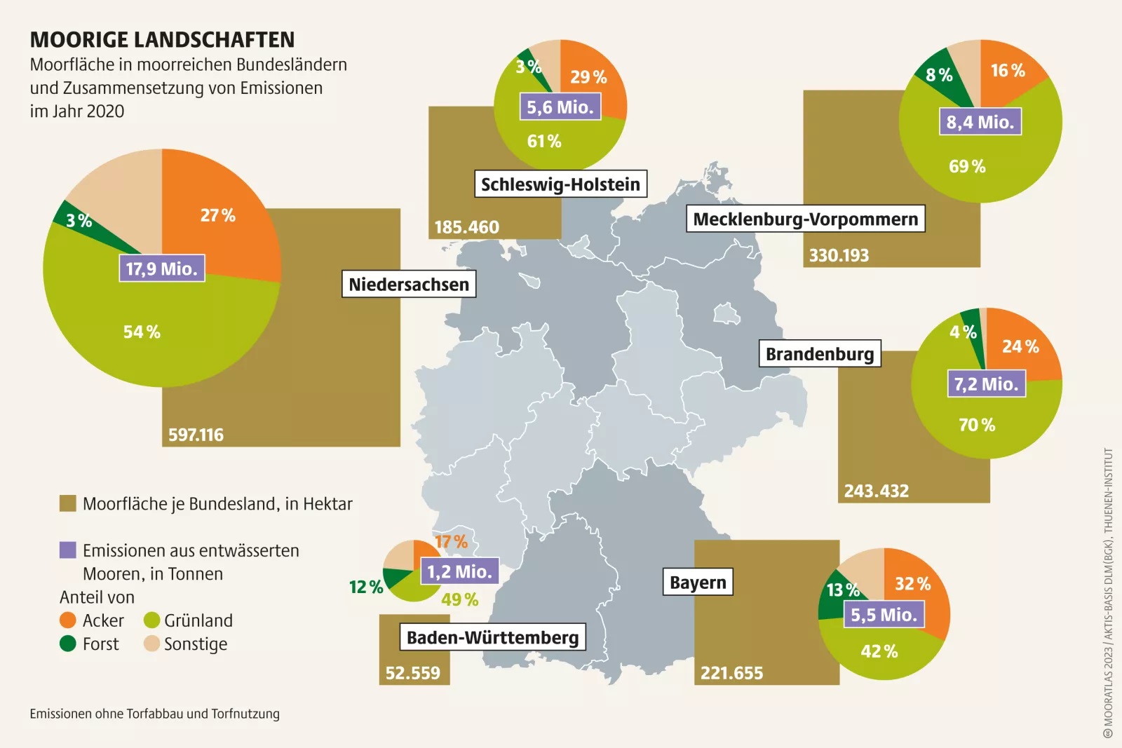Moorböden machen in Deutschland etwa acht Prozent der landwirtschaftlich genutzten Fläche aus. Zuletzt stammten etwa 53 Millionen Tonnen CO2-Emissionen und damit rund 6,7 Prozent der deutschen Treibhausgasemissionen aus der Zersetzung von Moorböden durch Entwässerungsmaßnahmen und Torfnutzung.