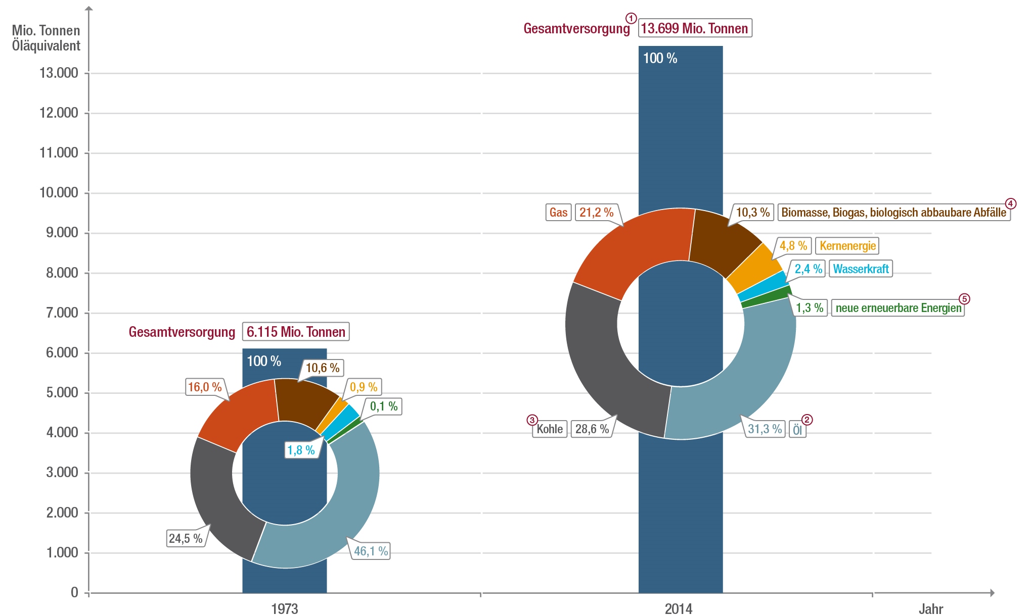 Gesamtversorgung in Mio. t Öläquivalent, weltweit 1973 und 2014