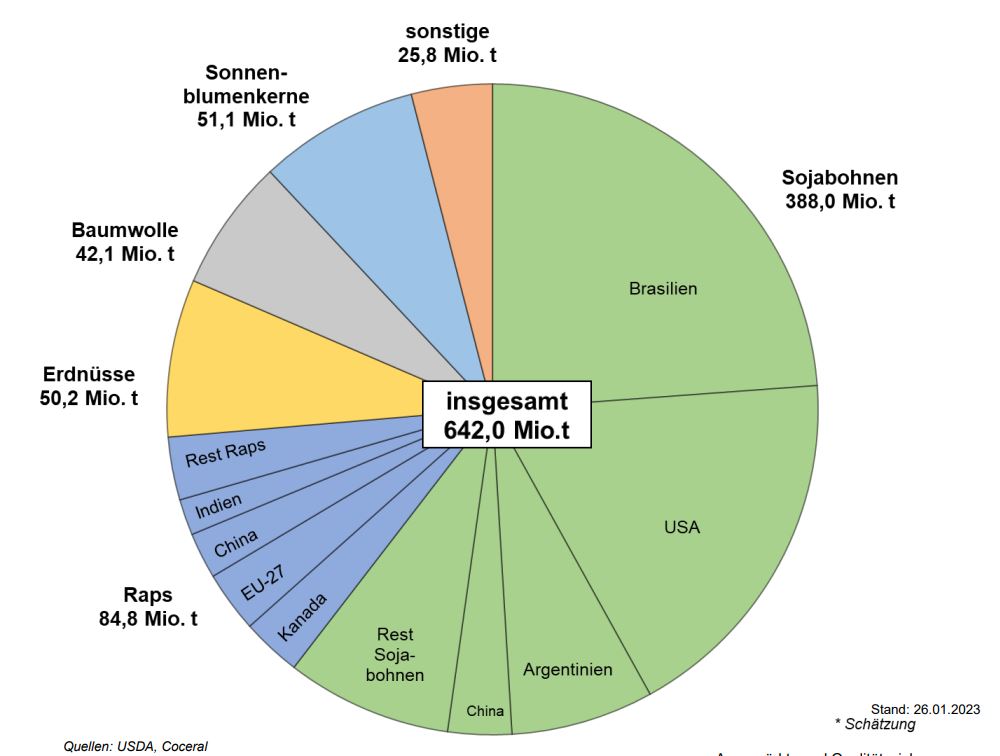 Die weltweite Erzeugung der sieben wichtigsten Ölsaaten beläuft sich nach Schätzung des USDA vom Januar 2023 im laufenden Wirtschaftsjahr 2022/23 auf 641,9 Mio. t. Dies wäre ein Plus gegenüber dem letztjährigen Wert (606,9 Mio. t) von + 5,8 %. 2022/23 stellt damit die größte Ölsaatenernte aller Zeiten dar. Die Sojabohnen haben mit 388,0 Mio. t (Vj. 358,1 Mio. t) einen Anteil von 60,4 % an der gesamten Ölsaatenproduktion. Die Rapserzeugung wird vom USDA mit 84,8 Mio. t angegeben (Vj.: 74,2; + 14,3 %). Mit einem Anteil von 13,2 % an der gesamten Ölsaatenproduktion nimmt der Raps weiterhin die zweite Stelle unter den wichtigsten Ölsaaten ein. Die Erntemengen anderer bedeutender Ölsaaten haben sich gegenüber dem Vorjahr unterschiedlich entwickelt. Die Ernte von Sonnenblumen wird auf 51,1 Mio. t (- 10,8 %), die von Erdnüssen auf 50,2 Mio. t (- 0,4 %) geschätzt. Bei Baumwollsaat wird mit 42,1 Mio. t (+ 1,0 %) etwas mehr erwartet als im letzten Jahr.