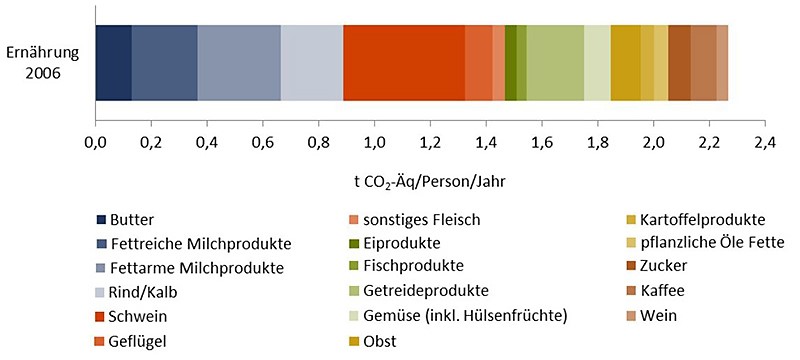 Speziell die THG-Emissionen machen einen wichtigen Teil der konsumbedingten Umwelteffekte aus (für viele andere Umwelteffekte liegen keine übersichtlichen Analysen vor). Mit Bezug auf die verschiedenen Lebensmittel erweisen sich tierische Produkte aufgrund der Veredelungsverluste auf der einen und durch ihren hohen Anteil an den Methan- und Lach-gasemissionen auf der anderen Seite als zentrale Treiber.